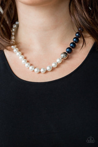 Separated by dainty silver beads, classic white pearls merge into blue pearls for a contemporary look. Infused with a shiny silver bead, the timeless pearls collect below the collar for a refined asymmetrical look. Features an adjustable clasp closure.