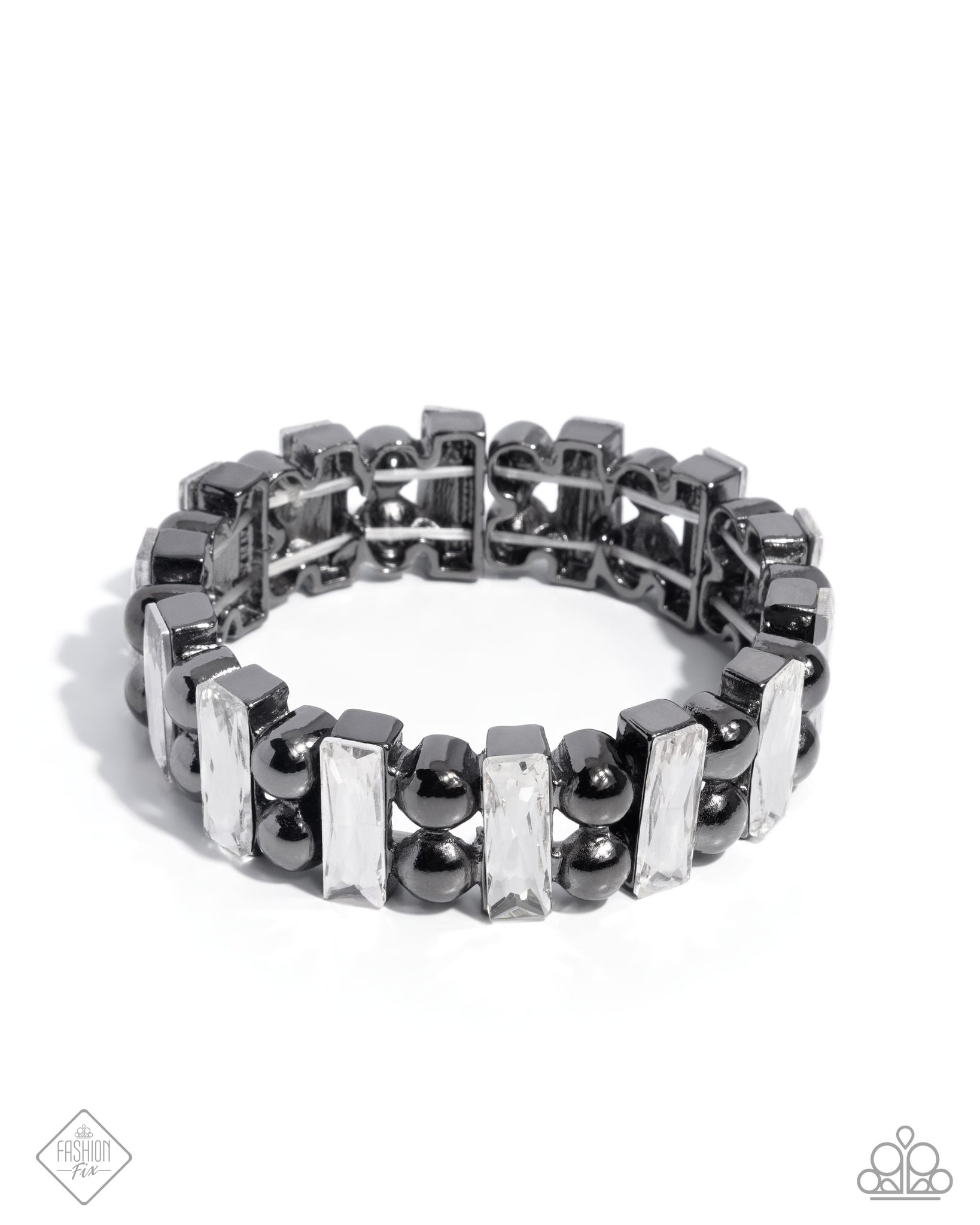 Infused along an elastic stretchy band, a collection of emerald-cut white gems in gunmetal fittings alternate beside stacked gunmetal beads for a dazzling determined display.