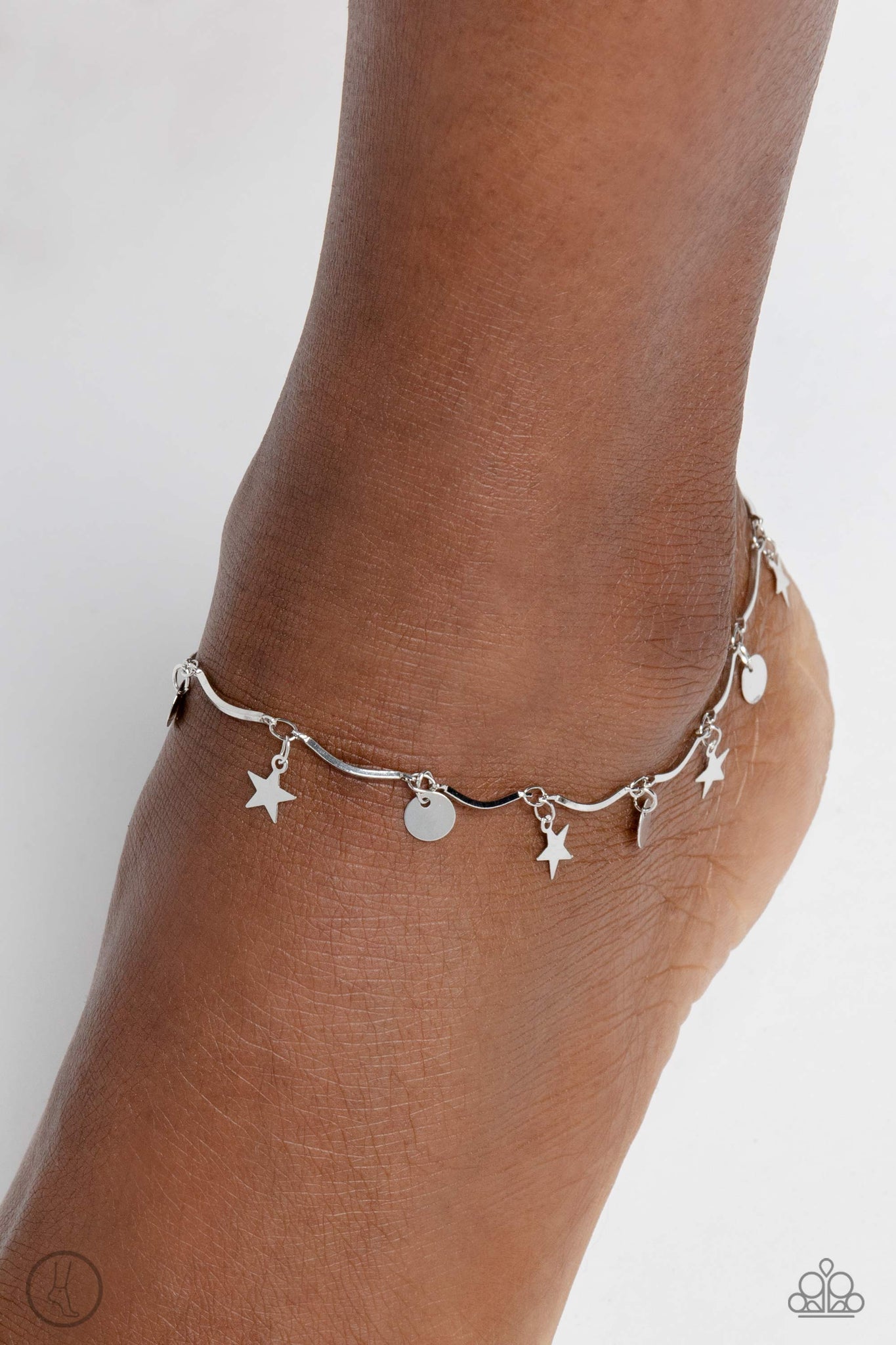 A fringe of sleek silver stars and discs swings from a dainty silver overlay chain, creating whimsical movement around the ankle. Features an adjustable clasp closure.