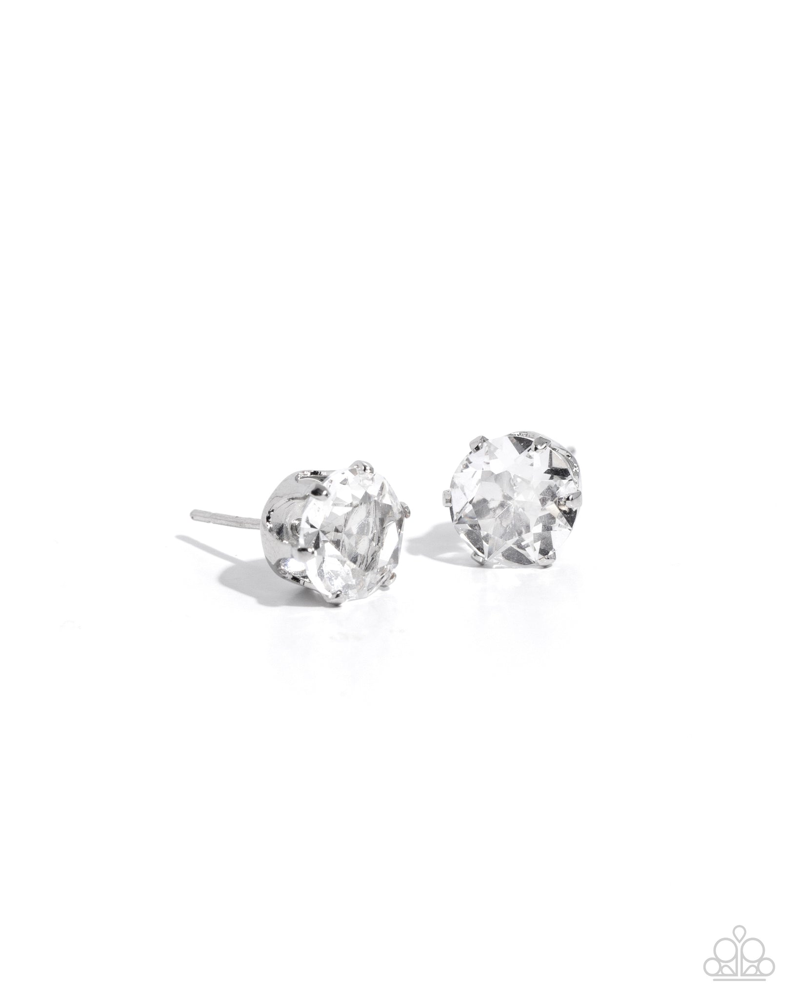 A sparkling white rhinestone is nestled inside a classic silver frame for a beautiful birthstone-inspired display. Earring attaches to a standard post fitting.