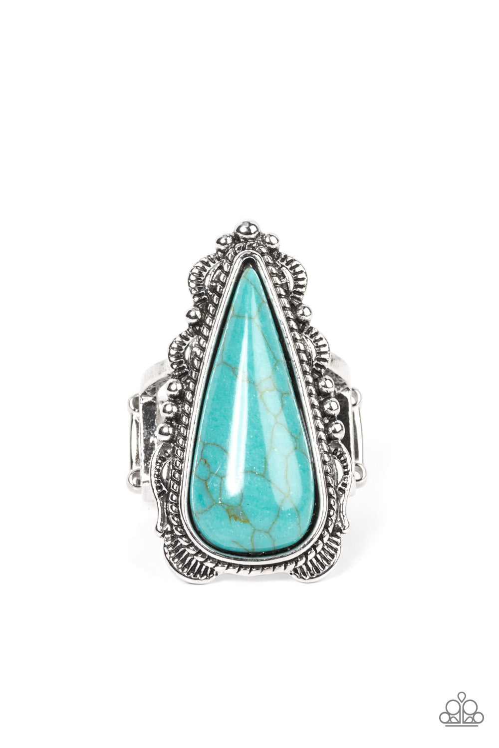 An oversized turquoise teardrop stone is nestled inside a silver frame studded and embellished in antiqued silver details for an authentic finish. Features a stretchy band for a flexible fit.