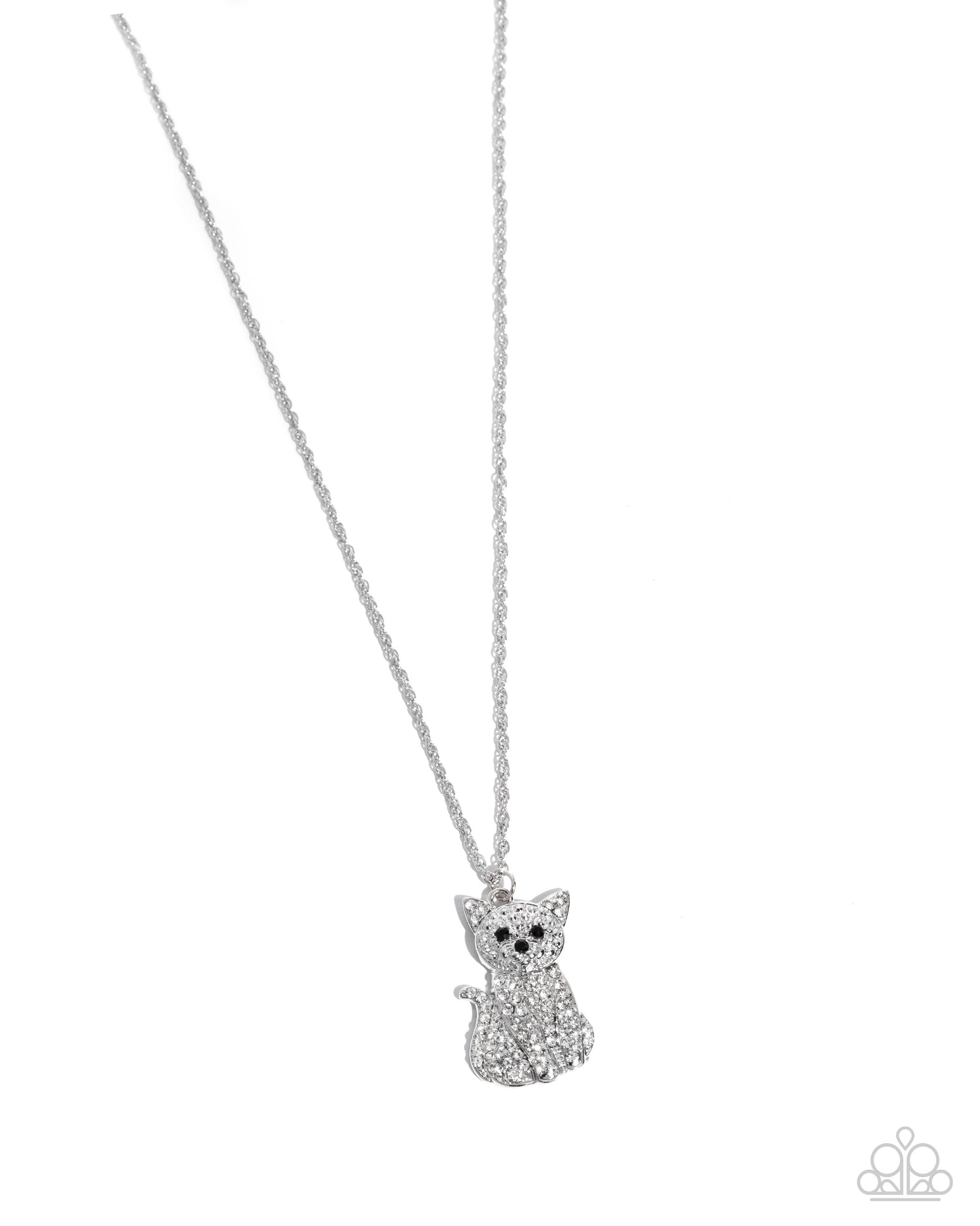 A delicate silver chain showcases a dazzling cat pendant. Encrusted with glittering rhinestones, the cat charm is given a whimsical yet sophisticated look. Its black rhinestone eyes and nose add an adorable contrast to the design, making it a charming accessory for any cat lover. Features an adjustable clasp closure.