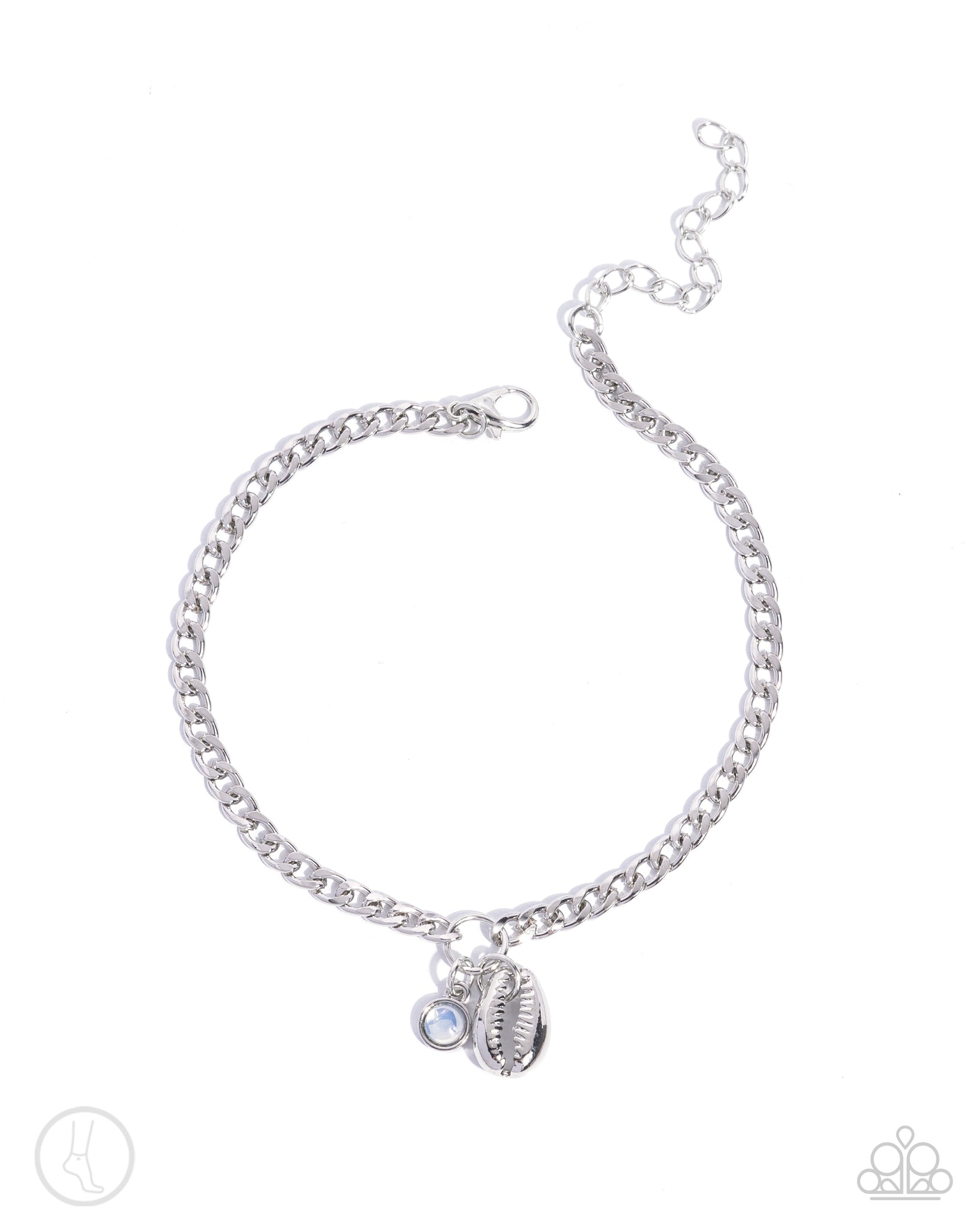 Attached to a silver ring, an opalescent white bead, and a silver conch shell swing from a silver curb chain around the ankle for a charming, coastal centerpiece. Features an adjustable clasp closure.