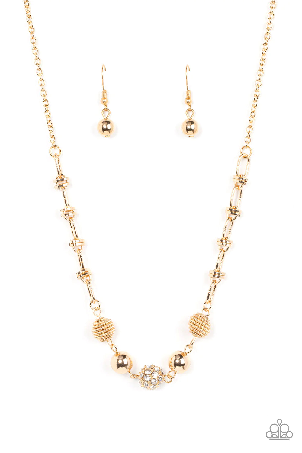 Pairs of gold coiled and smooth gold beads flank a white rhinestone encrusted bead along an oval and gold disc linked chain, creating a glitzy combination below the collar. Features an adjustable clasp closure.re.