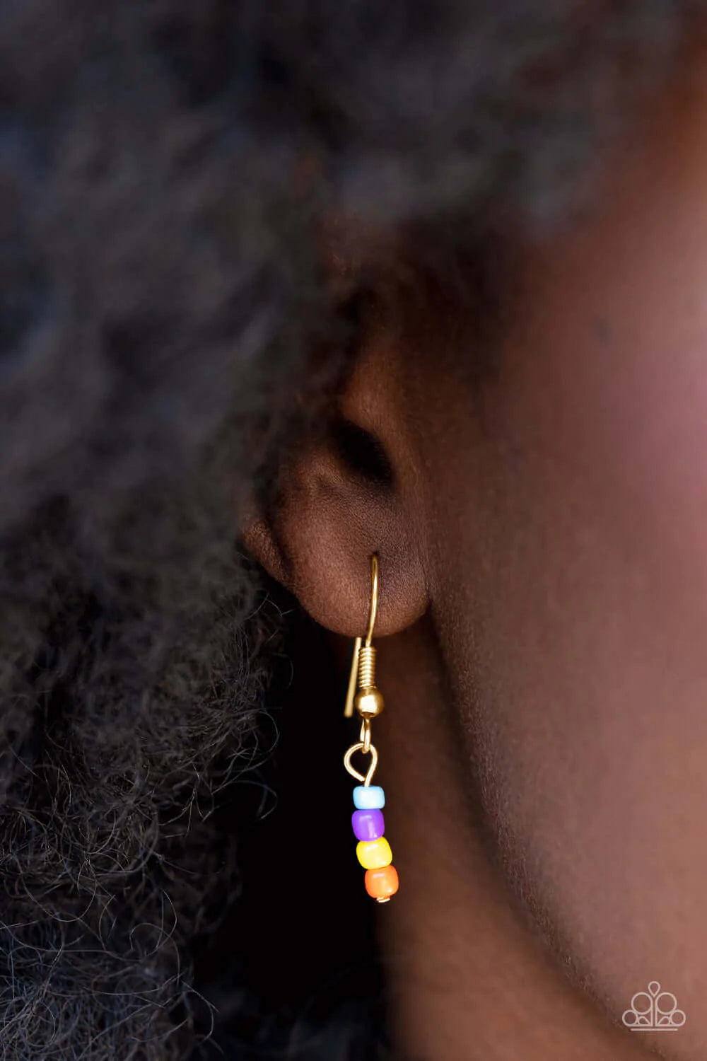 Layered together with a bold gold chain, dainty multicolored seed beads and yellow smiley face beads are threaded along an invisible wire below the collar, resulting in a colorfully retro design. Features an adjustable clasp closure.