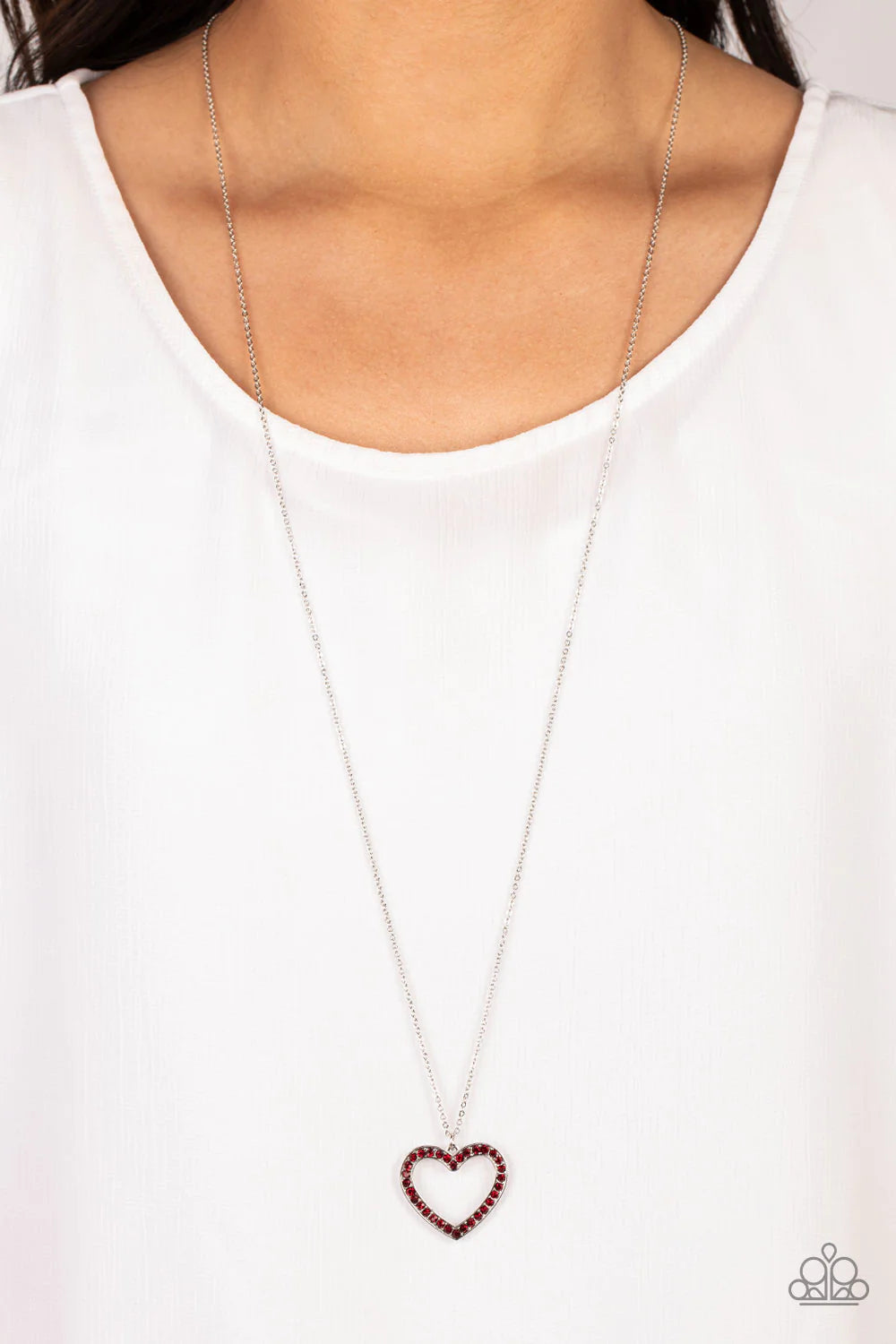 A silver heart-shaped silhouette is outlined with a border of slam rhinestones and suspended from the bottom of a long silver chain. The colorful rhinestones infuse the simple concept with irresistible sparkle, bringing a hint of glam to the charming design. Features an adjustable clasp closure.