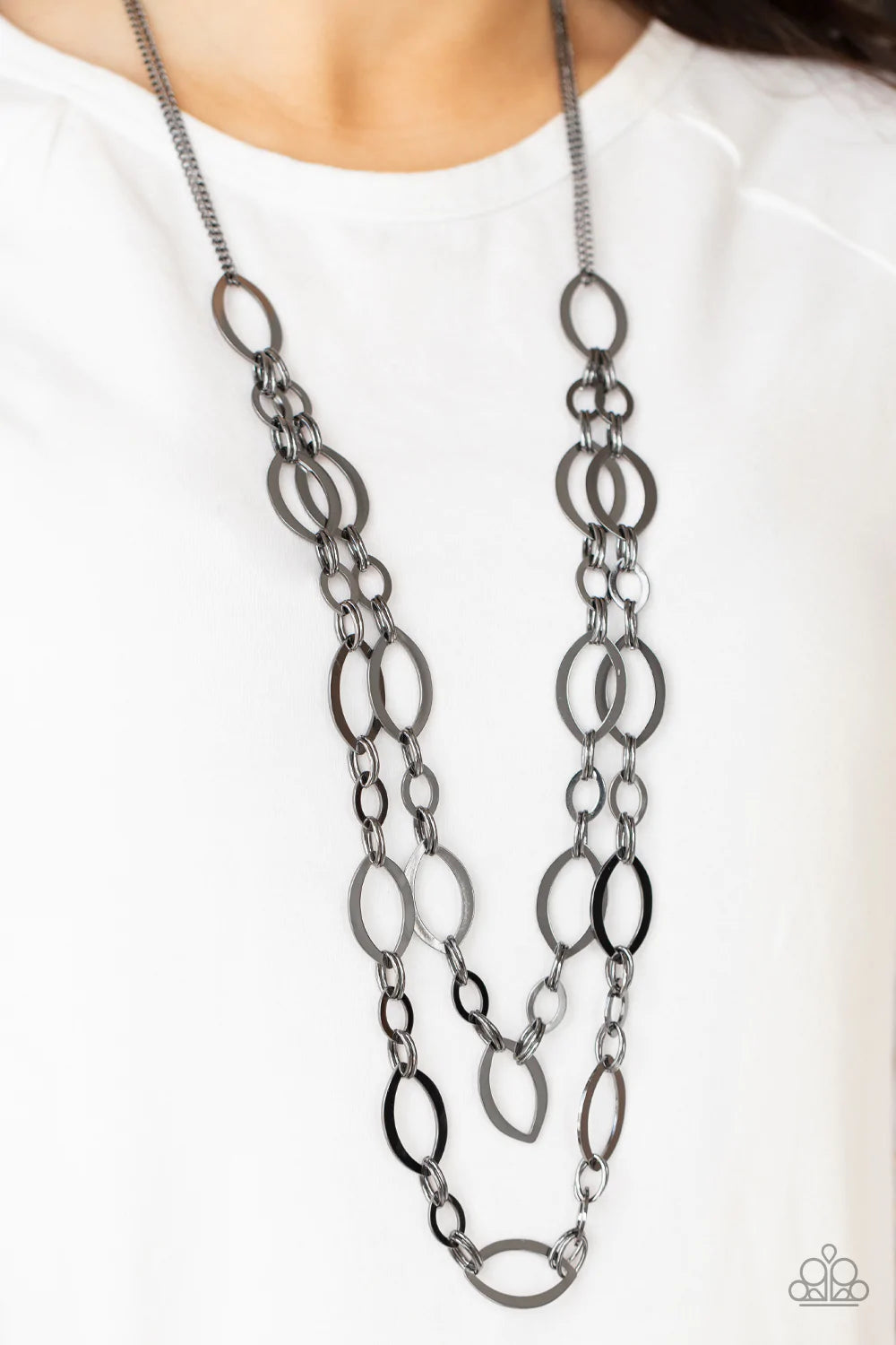 Stunning gunmetal ellipses link together for two layers of bold, basic drama. The layers hang from a simple gunmetal chain adding balance to the scene. Features an adjustable clasp closure.