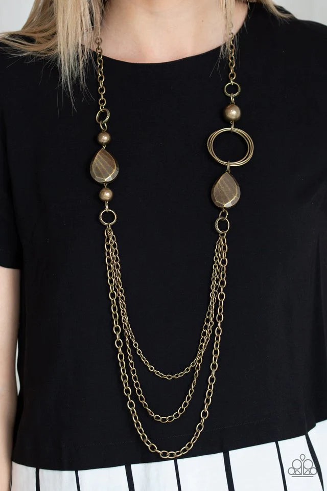A mismatched collection of oversized brass beads, hoops, and textured brass accents give way to layers of antiqued brass chains down the chest for an edgy industrial look. Features an adjustable clasp closure.