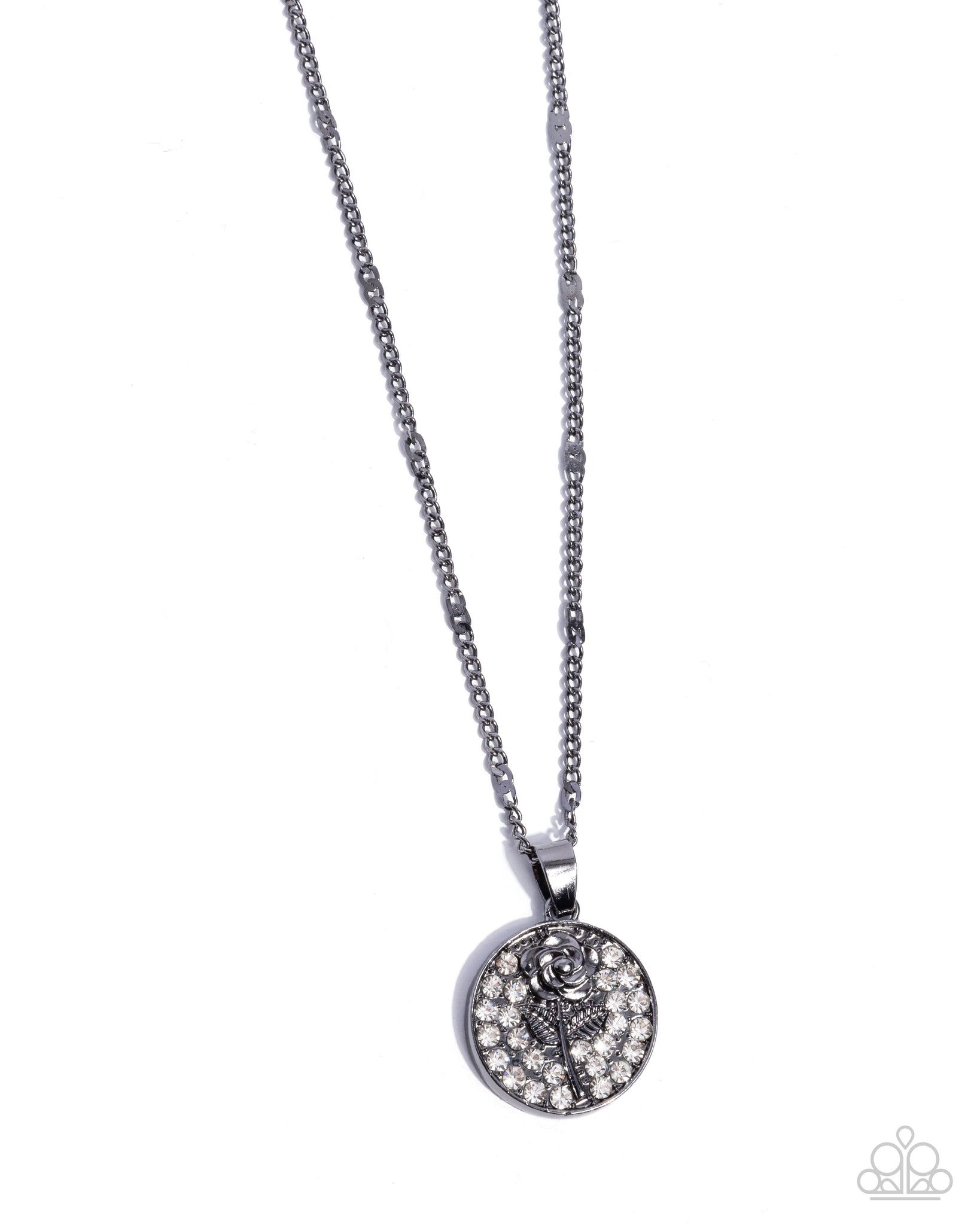 Embellished in glistening white rhinestones, a shiny gunmetal rose is featured front and center in a shiny gunmetal pendant that glides along a gunmetal chain for a fairytale-inspired fashion. Features an adjustable clasp closure.