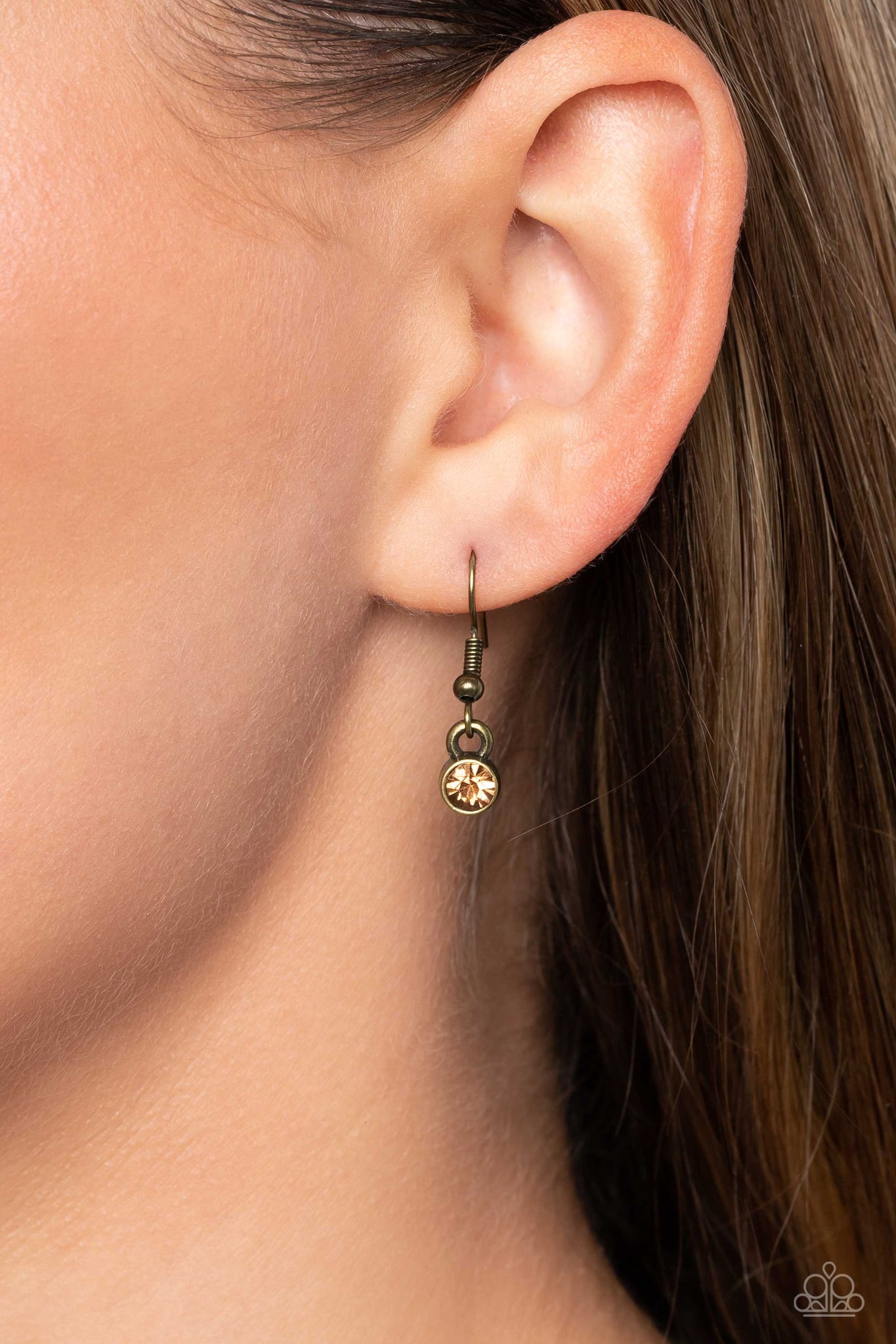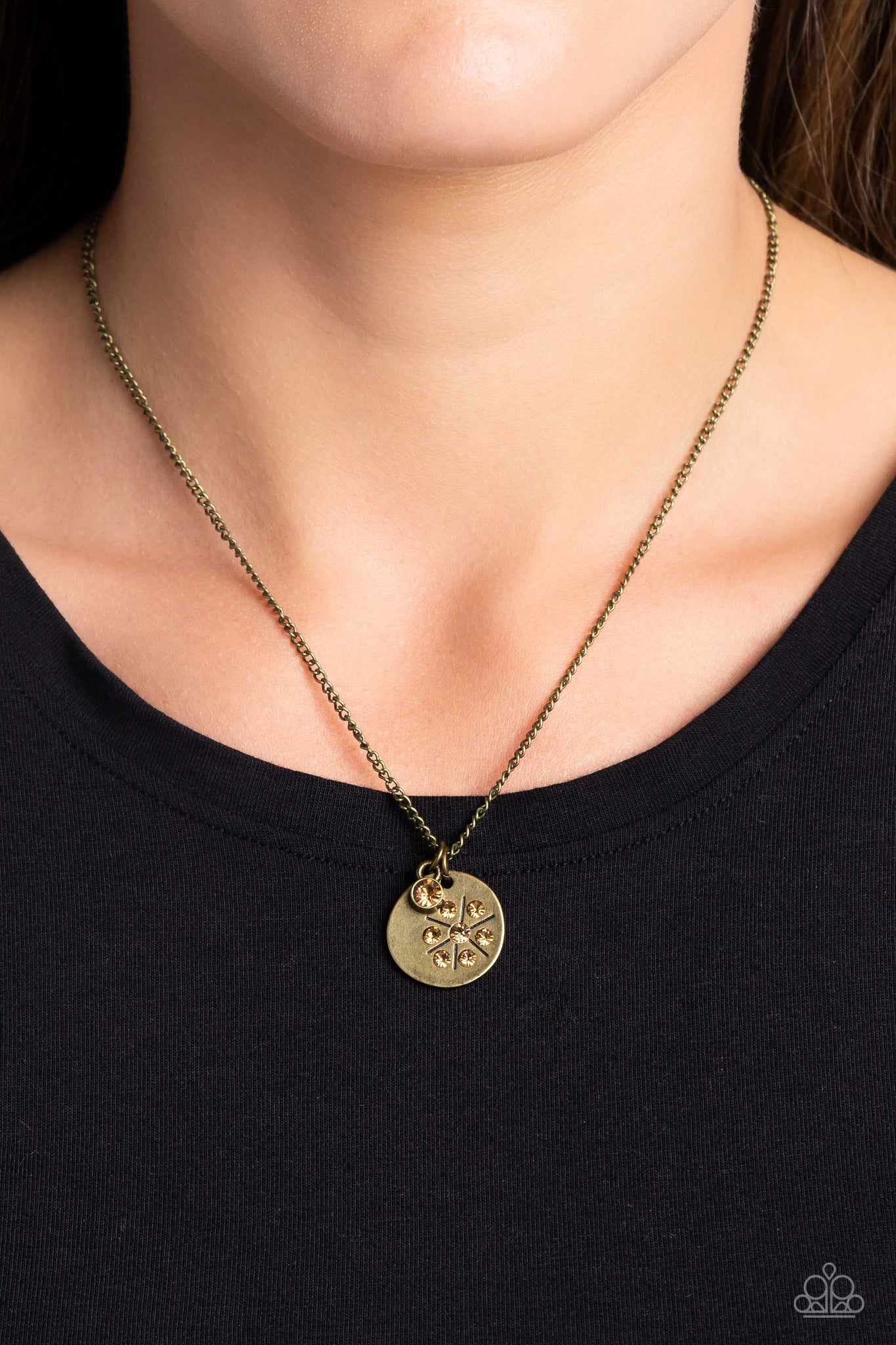 Falling from a dainty brass chain, a brass disc is embossed with rhinestones that encircle around a dandelion stamped shape. Gliding next to the brass disc, a solitaire light topaz rhinestone set in a brass frame adds an additional pop of color to the whimsical design. Features an adjustable clasp closure.
