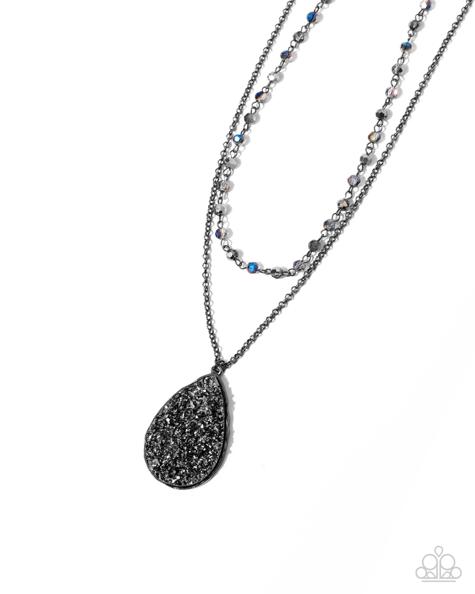 Infused along a classic gunmetal chain, a collection of faceted gunmetal and UV shimmery beads coalesces below the neckline. Featuring asymmetrical and triangular cuts, black druzy-like accents are encased inside a teardrop gunmetal frame, layering below the faceted beads on a classic gunmetal chain for a jaw-dropping lure. Features an adjustable clasp closure.