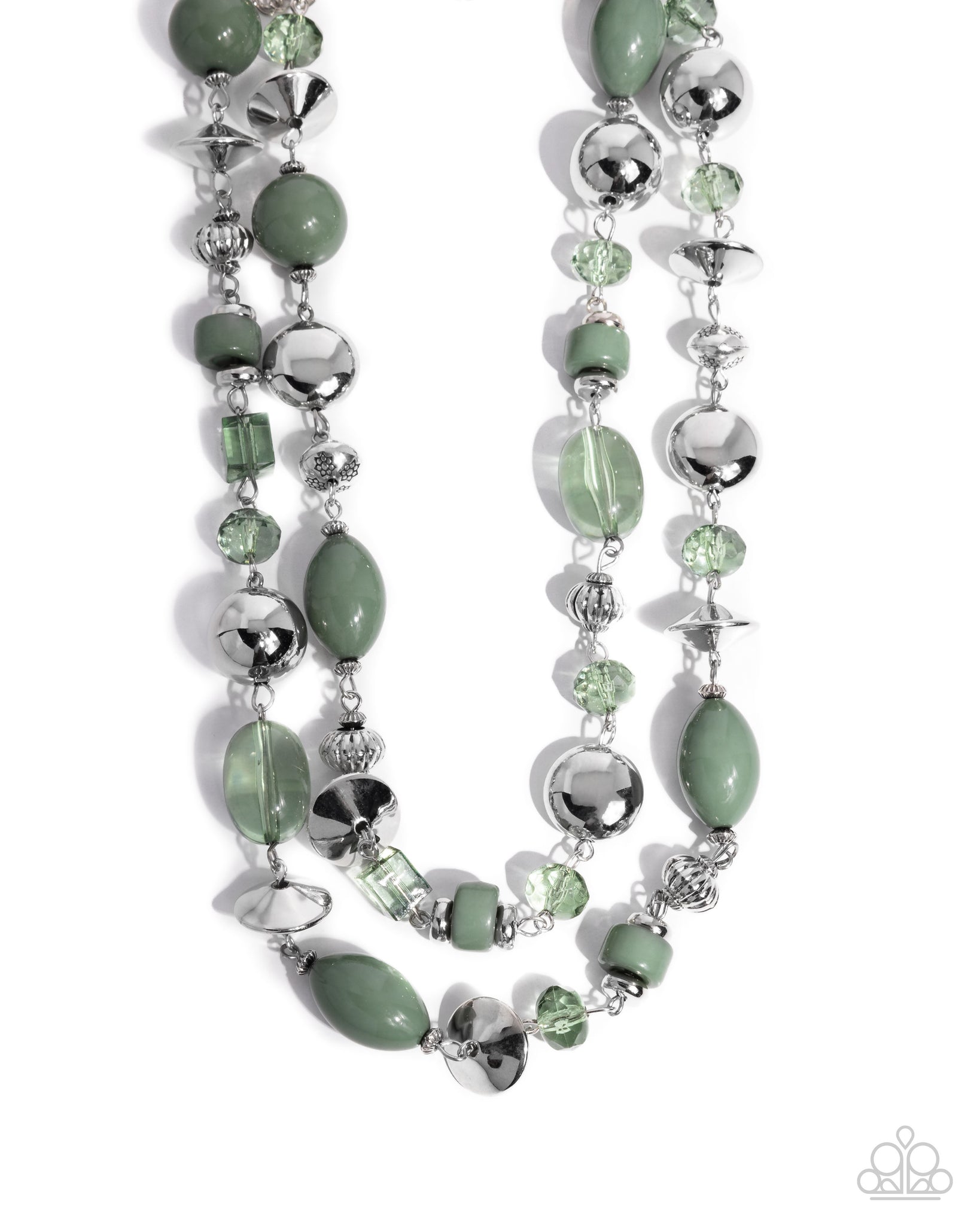 Two strands of tranquil jade green and silver beads create a sophisticated layered look. The design features a mix of translucent, opaque, and metallic beads in various shapes, including round, oval, and faceted elements, adding texture and depth. The soft green hues are complemented by the polished silver tones, making this design a versatile addition to any wardrobe. Features an adjustable clasp closure.