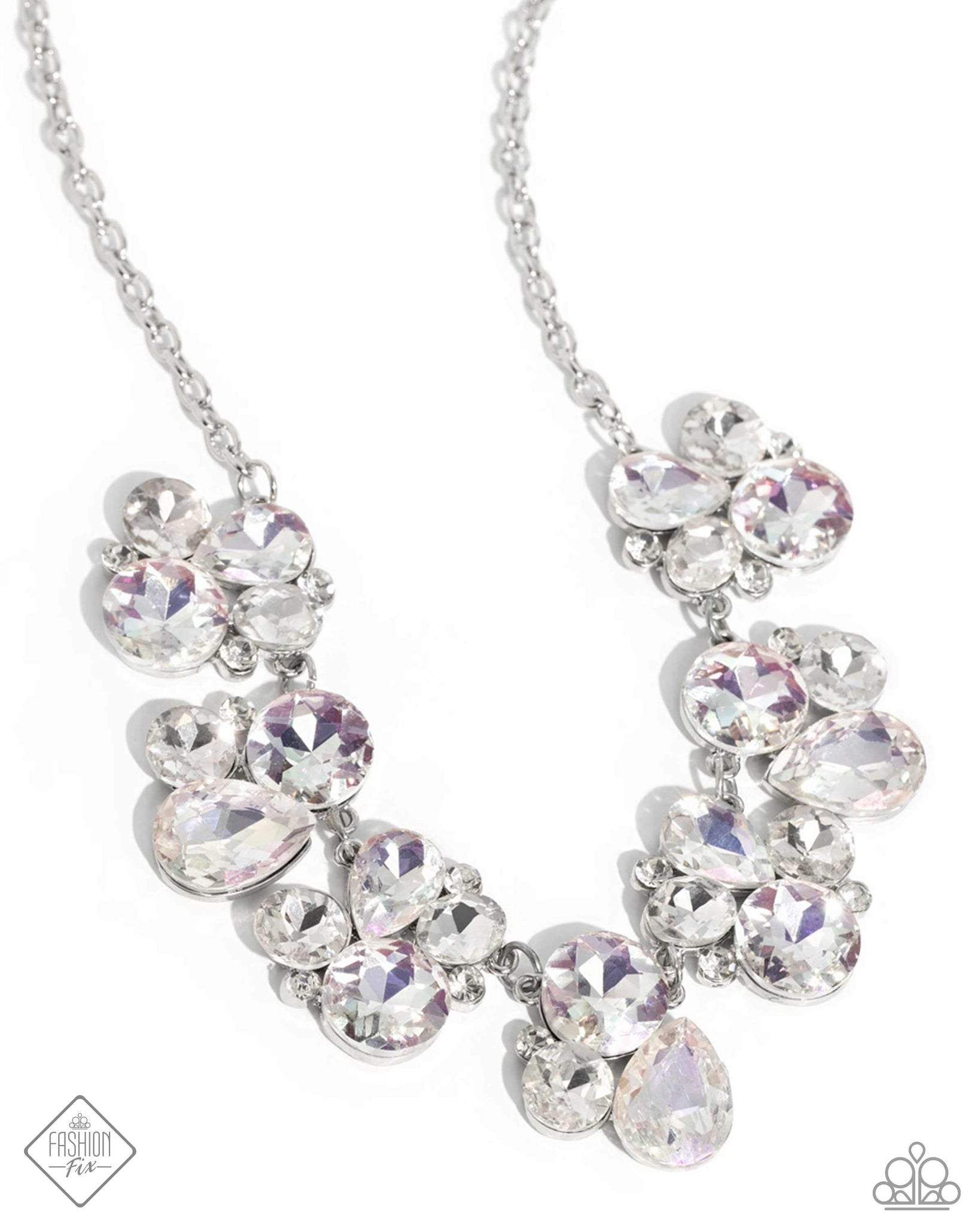 Featuring an iridescent sheen, a faceted display of round and teardrop white gems in various sizes cluster around the neckline for a fairytale finish. Features an adjustable clasp closure. Due to its prismatic palette, color may vary.