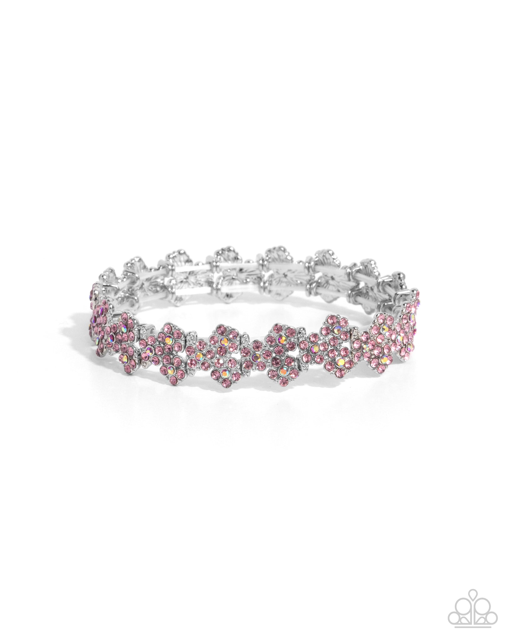Infused along elastic stretchy bands, stacked silver flowers made up of light rose rhinestone petals around rose iridescent centers alternate with solitaire pink rhinestone flowers along the wrist for a whimsical pop of color. Due to its prismatic palette, color may vary.