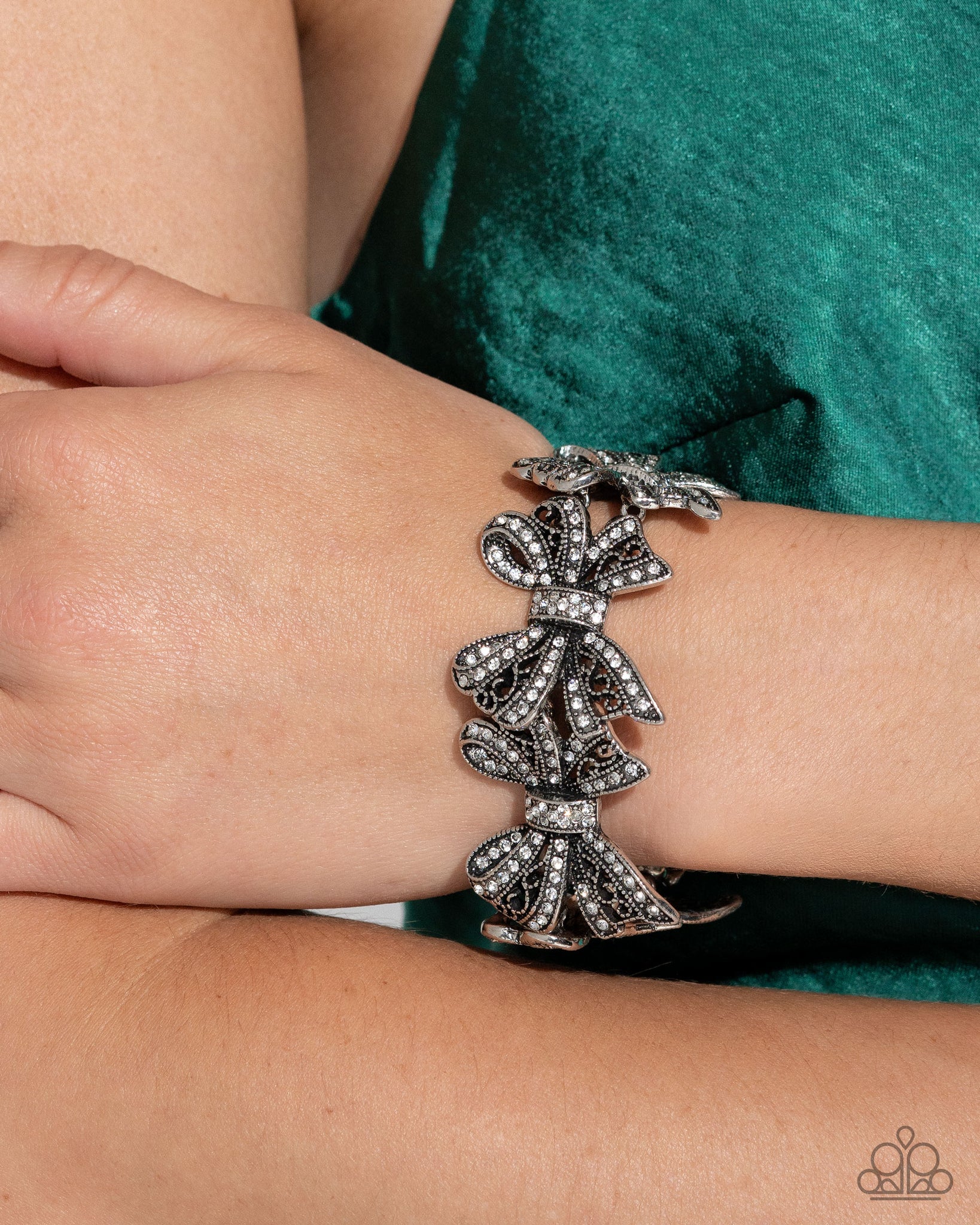 Infused along elastic stretchy bands, dynamic, curly, airy silver bows, embellished with row after row of dazzling white rhinestones glistens along the wrist for an ultra-feminine display.
