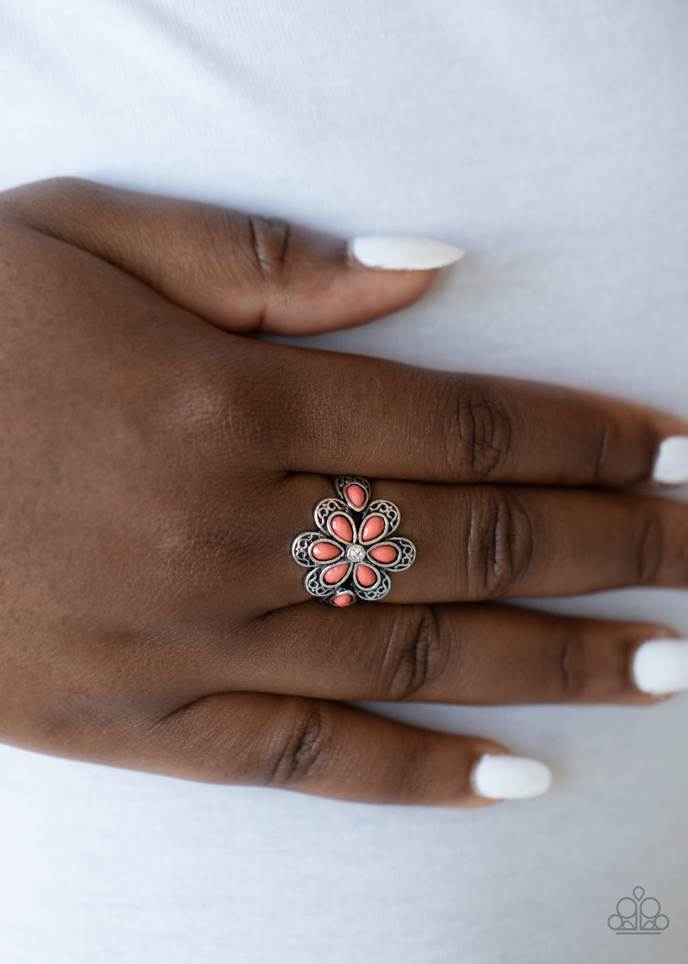 A collection of decorative silver petals topped with coral accents fans out around a dainty white rhinestone center, creating a whimsical frame atop the finger. Features a dainty stretchy band for a flexible fit.