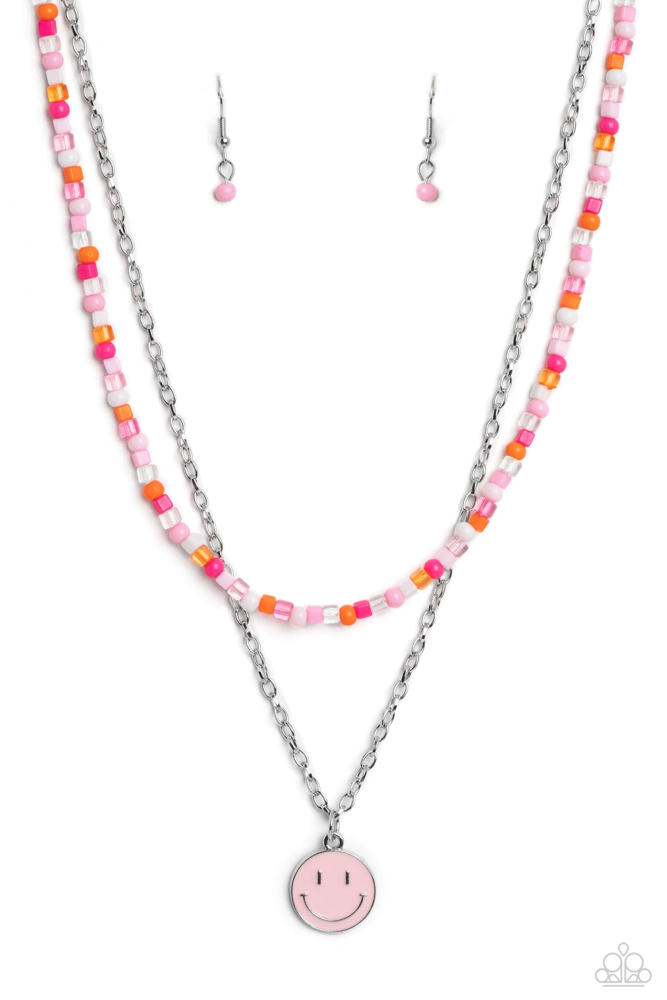 Gliding from a dainty, silver chain, a smiley face pendant stands out against a pink backdrop. Completing the charismatic ensemble, a collection of seed beads in shades of light pink, white, pink, orange, and hot pink create bright pops of color around the neckline for a youthful finish. Features an adjustable clasp closure.