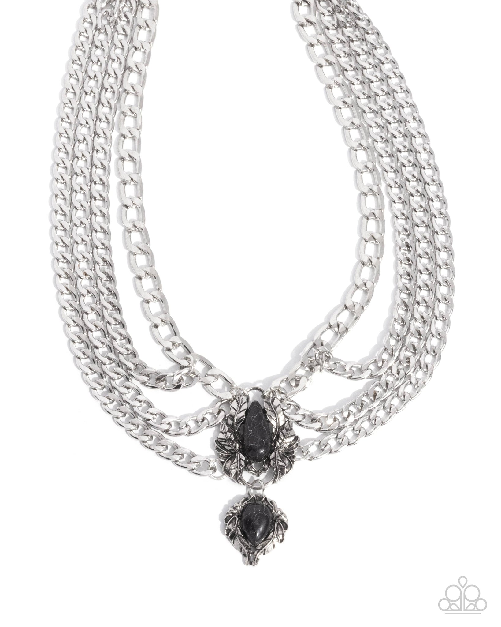 Connecting to intricately detailed silver laurel frames, copious strands of curb silver chains span along the neckline, highlighting the centermost black-marbled teardrop stone which gives way to a suspended smaller laurel silver frame featuring an upside-down black-marbled teardrop stone for a one-of-a-kind opulently earthy display. Features an adjustable clasp closure. As the stone elements in this piece are natural, some color variation is normal.