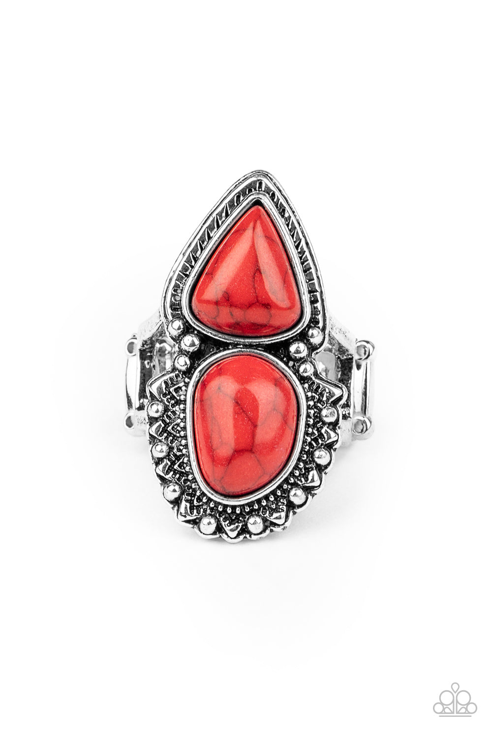 A pair of imperfect oval and triangular red stones are pressed into asymmetrically studded silver frames, creating a colorful stacked look atop the finger. Features a stretchy band for a flexible fit.