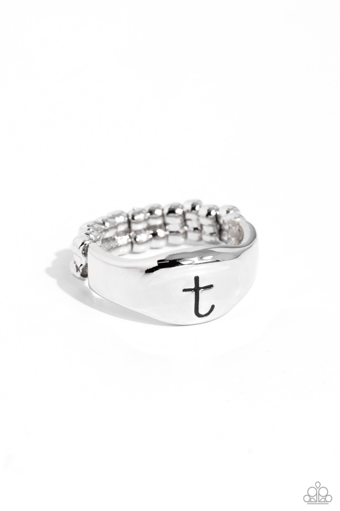 Pressed into the center of a beveled silver band, the black letter "t" stands out for a simple, sentimental centerpiece. Features a stretchy band for a flexible fit.