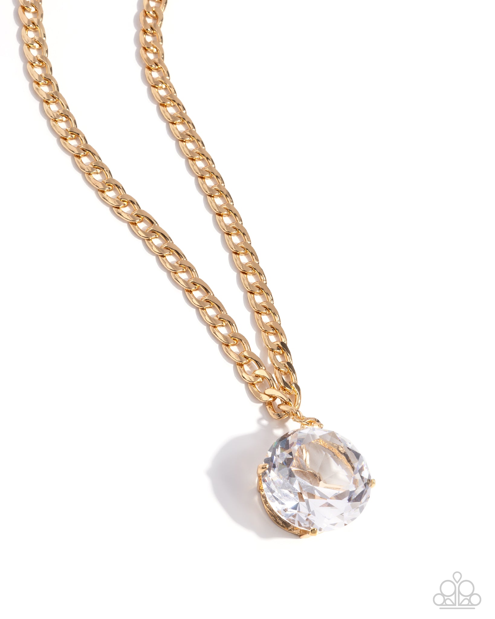 Set in a dainty gold-pronged fitting, an exaggeratedly large faceted white gem sparkles brilliantly from a gold curb chain, creating a stunning solitaire design. Features an adjustable clasp closure.