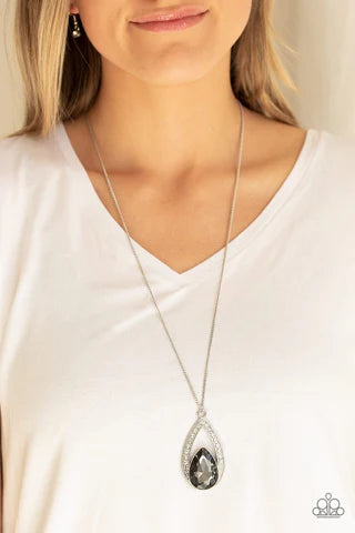 A glittery black teardrop gem is pressed into a silver frame radiating with glassy white rhinestones. The glamorous pendant swings from the bottom of a shimmery silver chain for a refined look. Features an adjustable clasp closure.