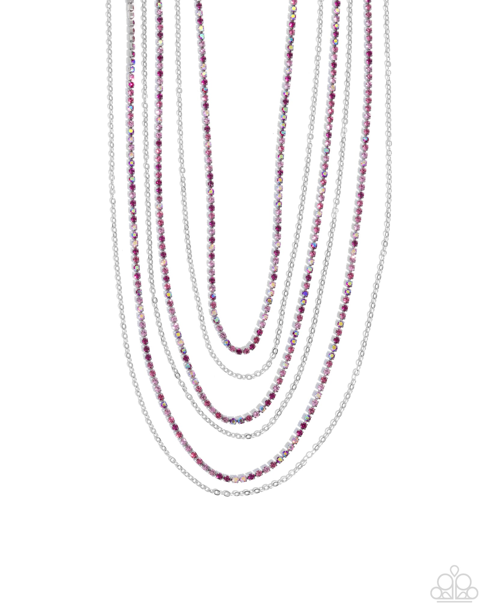 A cascade of shimmering silver chains alternates with rows of faceted fuchsia, light rose, iridescent, and rose rhinestones, creating a bold and dazzling layered effect. The reflective surfaces of the beads enhance the multi-strand design with a touch of brilliance. Features an adjustable clasp closure.