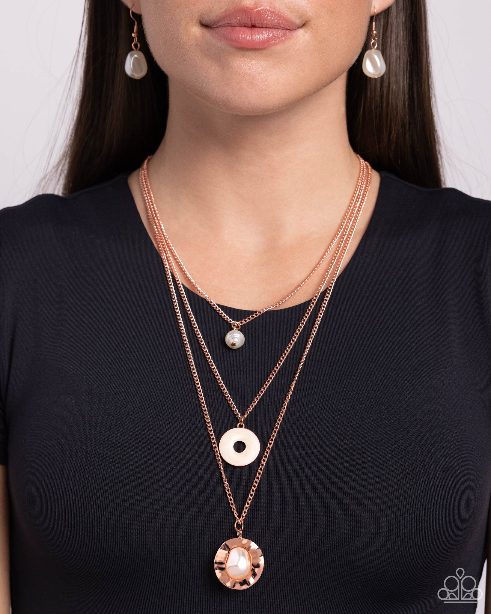 Three mismatched shiny copper chains layer below the collar. A glossy baroque white pearl swings from the uppermost chain above a peach pearl-painted disc and hammered shiny copper pendant with a white baroque pearl center for a dignified layered look. Features an adjustable clasp closure.