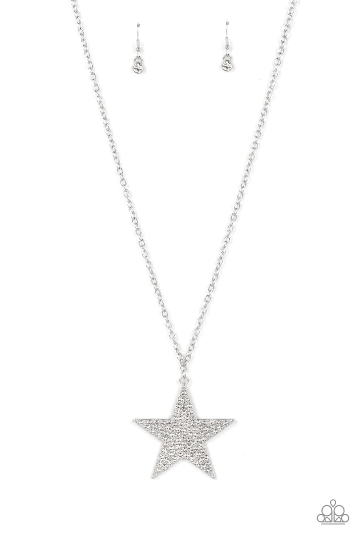The front of an oversized silver star is encrusted in blinding white rhinestones, resulting in a stellar pendant at the bottom of a lengthened silver chain. Features an adjustable clasp closure.