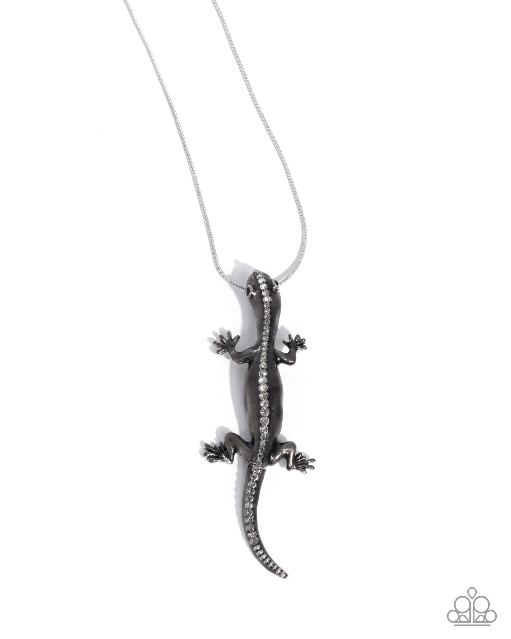 A striking gunmetal salamander-shaped pendant swings from a dainty silver snake chain. A row of dazzling white rhinestones runs along the spine, adding a touch of sparkle to the edgy design. The tail hinges to the body for added movement. Features an adjustable clasp closure.