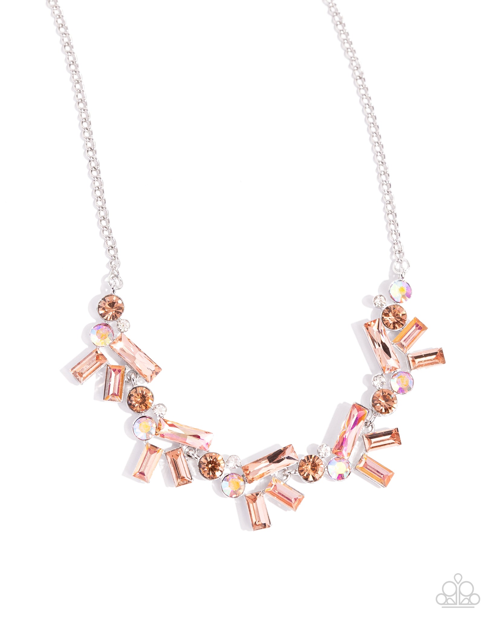 Set in various shapes, peach, orange iridescent, and UV shimmery rhinestones and gems cascade from a classic silver chain around the neckline for a scattered display of shimmer. Features an adjustable clasp closure. Due to its prismatic palette, color may vary.
