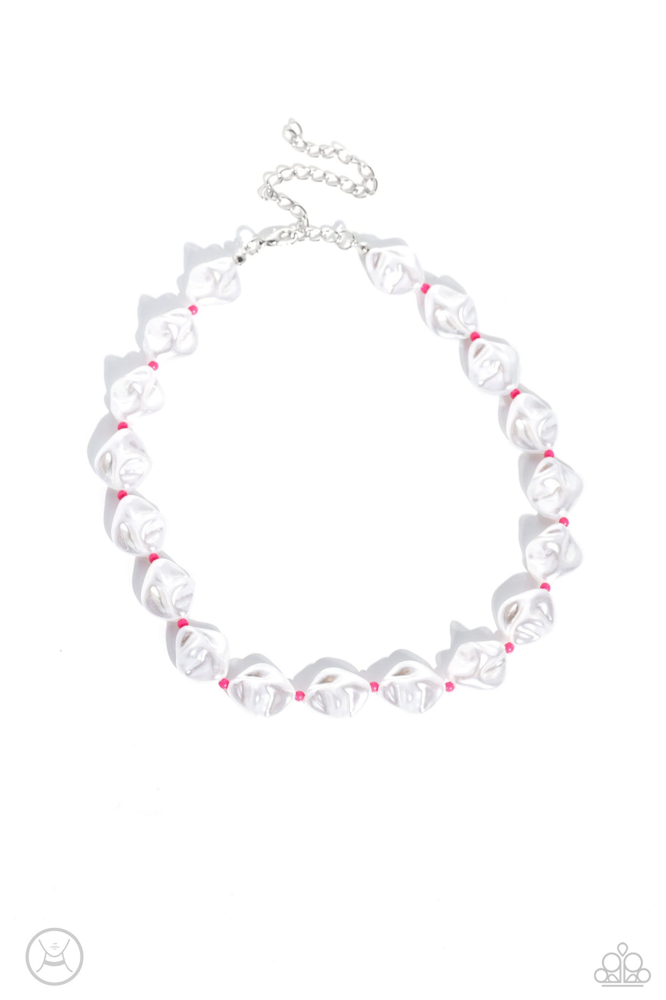 Rippling in texture, baroque white pearls alternate with Pink Peacock seed beads around the collar for a beachy statement. Features an adjustable clasp closure.