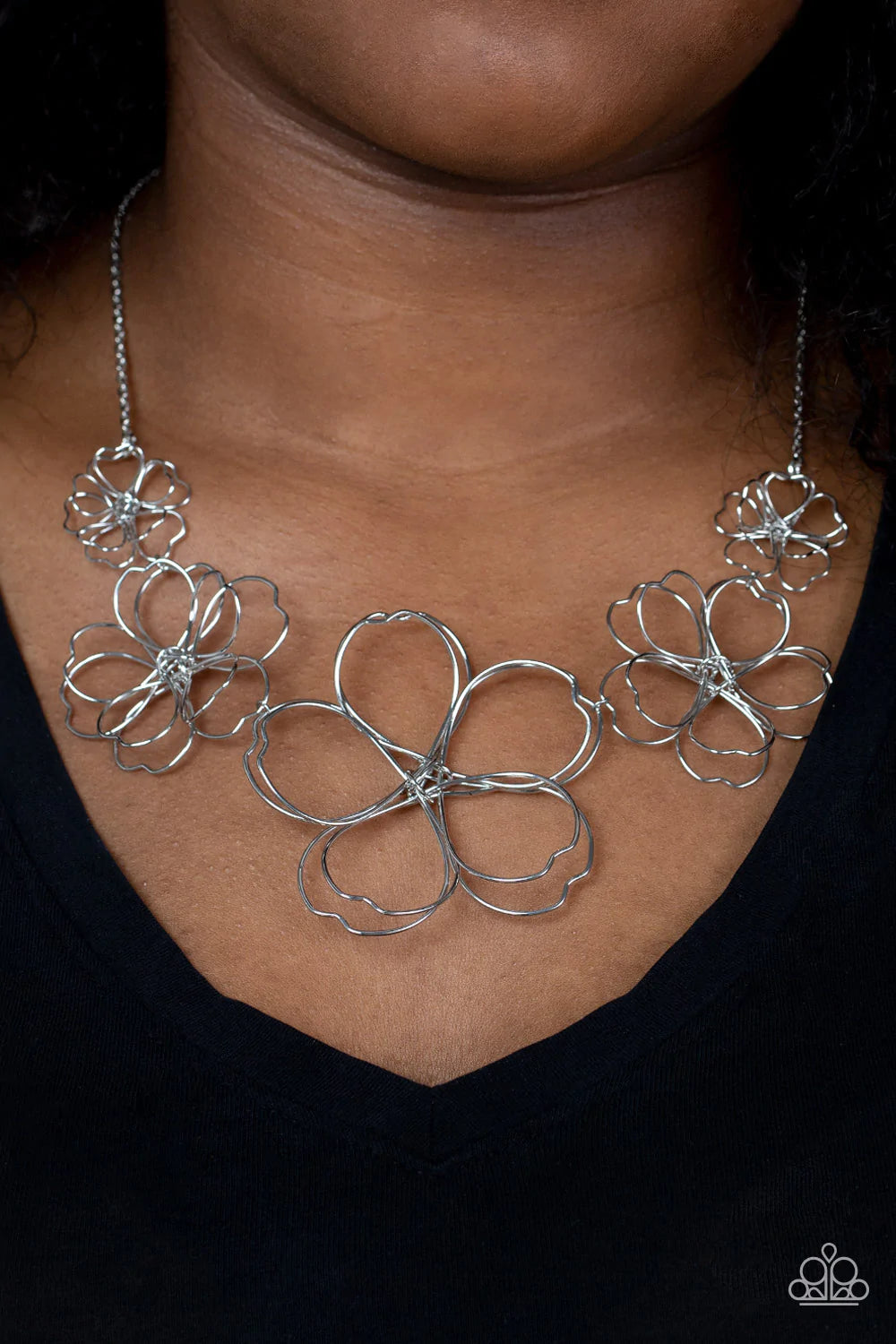 Glistening silver wire delicately twists into oversized blossoms. Gradually increasing in size, the 3D frames elegantly pop beneath the collar. Features an adjustable clasp closure.