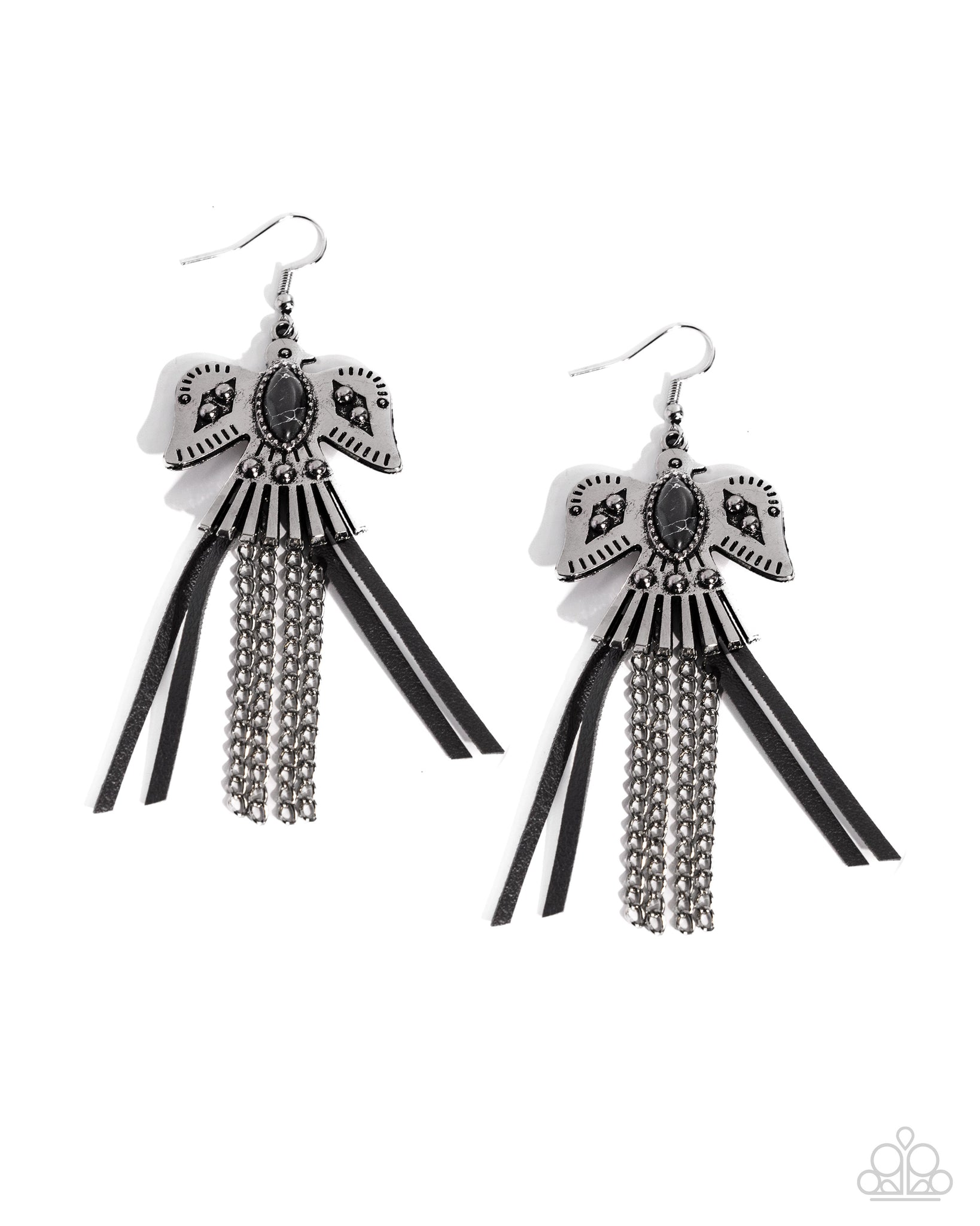 Featuring a black-marbled marquise-cut stone, a silver-studded eagle charm dangles below the ear. A quartet of silver chains and strips of black leather strands soar below the eagle for additional free-spirited flourishes. Earring attaches to a standard fishhook fitting. As the stone elements in this piece are natural, some color variation is normal.