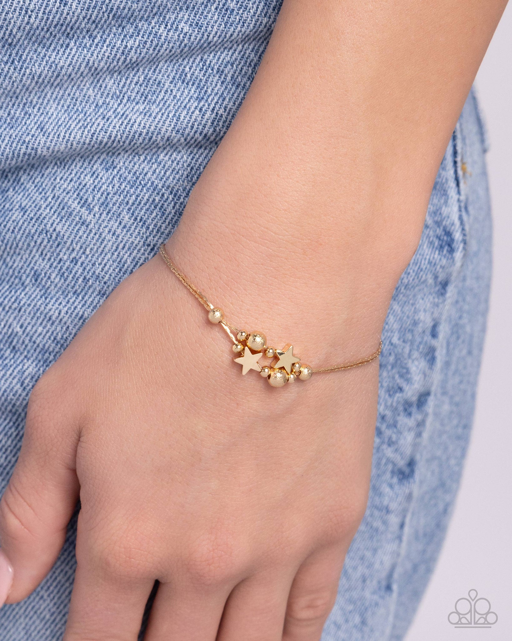 Infused along dainty strands of gold Boston link chains, a collection of shiny and shattered gold beads join gold stars at the center of the wrist for a stellar, sassy display. Features an adjustable clasp closure.