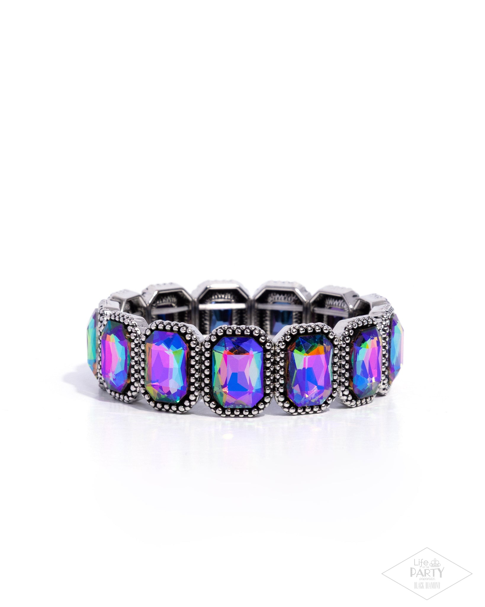 Oversized emerald style oil spill gems are encased in antiqued studded frames that are threaded along stretchy bands around the wrist, creating a smoldering centerpiece. Due to its prismatic palette, color may vary.