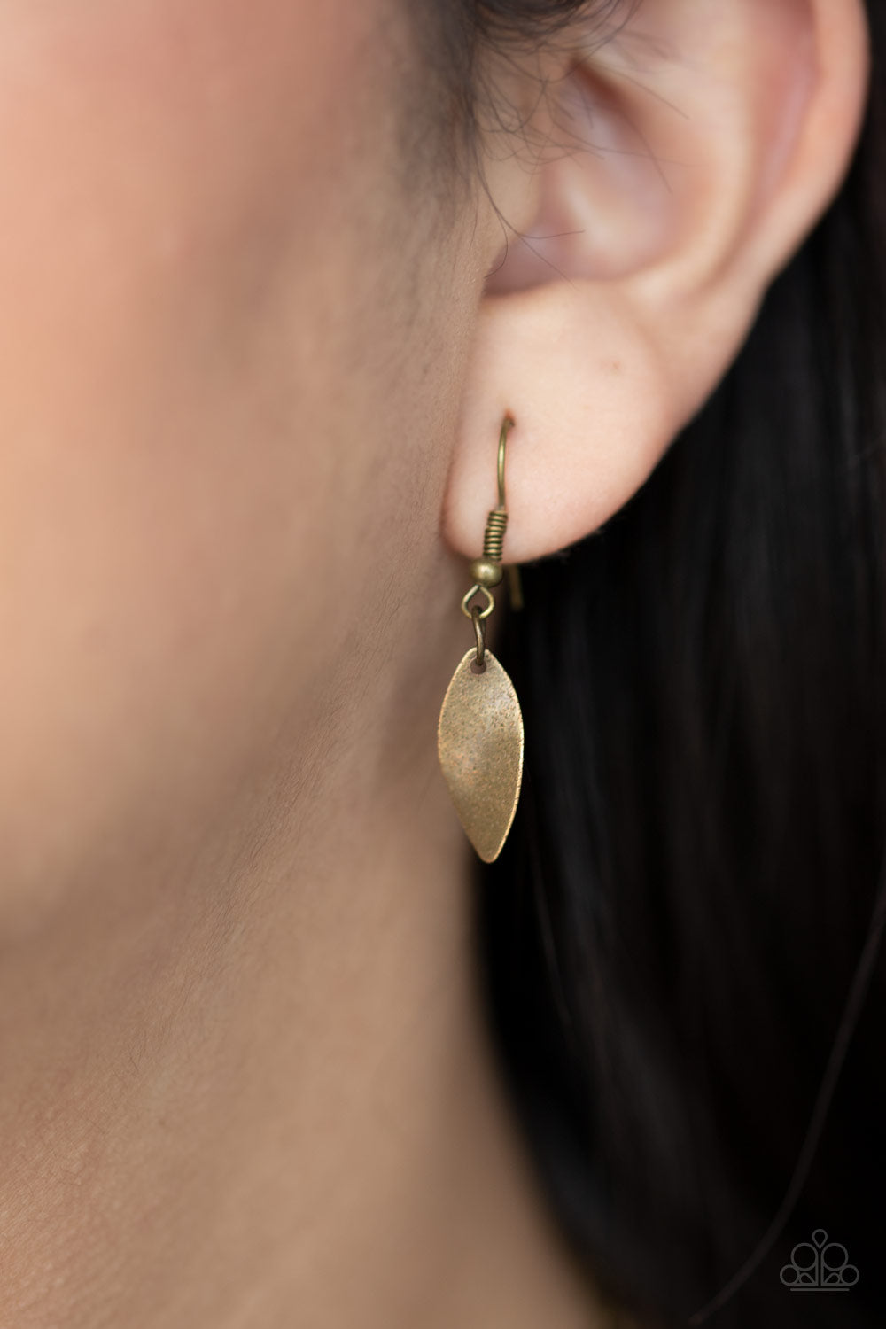 A pair of brass marquise shaped frames are left open at the top, where robust brown beads are suspended. Brass discs in the same marquise shape are subtly curved to catch the light as they border each frame, creating an earthy fringe. The pendants swing from the bottom of a long brass chain, creating a flirtatious statement piece. Features an adjustable clasp closure.