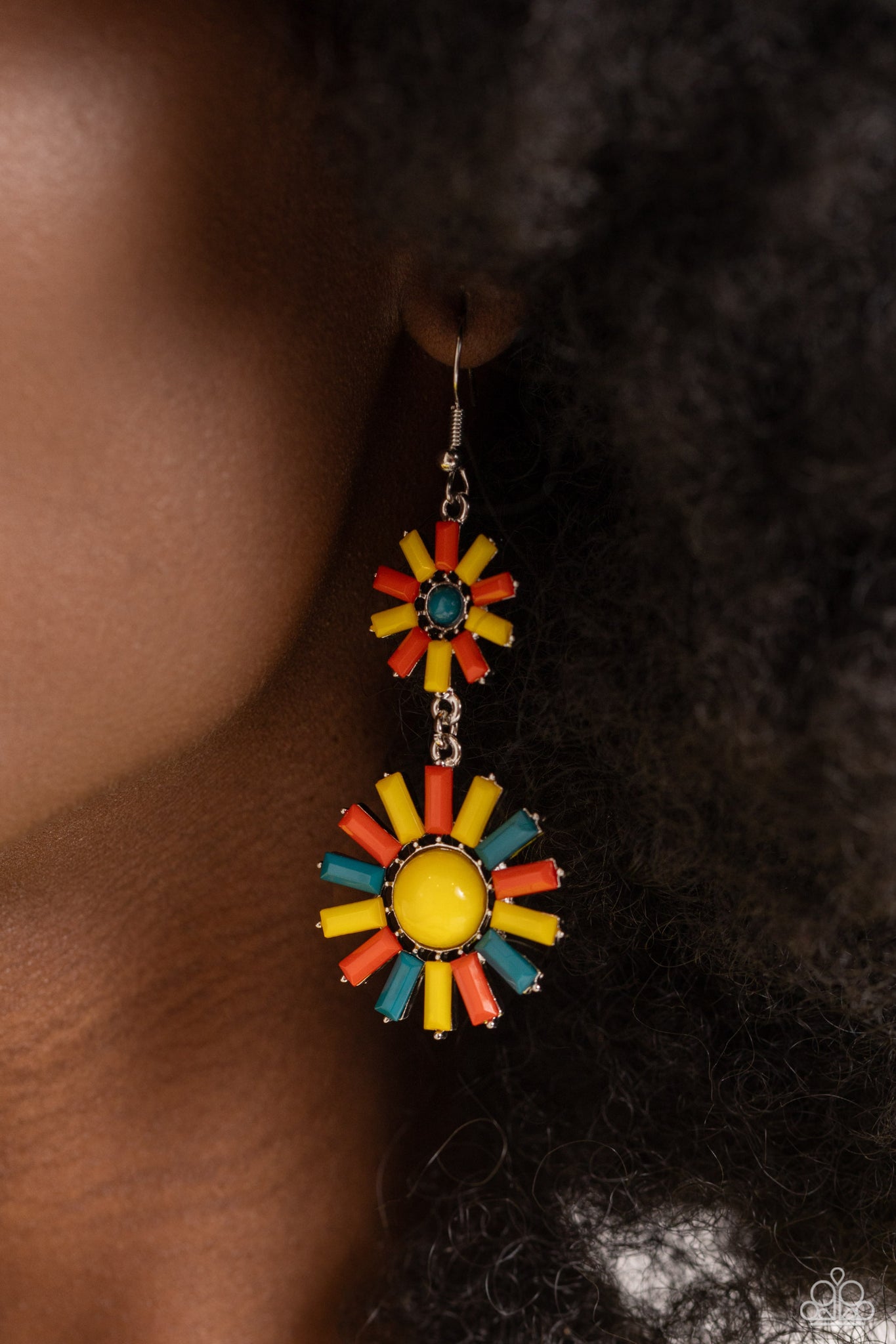 Dotted with a Harbor Blue center, emerald-cut High Visibility and Burnt Orange bars encircle a dainty sunburst frame. Dotted with a larger High Visibility center, emerald-cut Harbor Blue, High Visibility, and Burnt Orange bars delicately fan around a larger sunburst frame, creating an overlapping sunny lure. Earring attaches to a standard fishhook fitting.