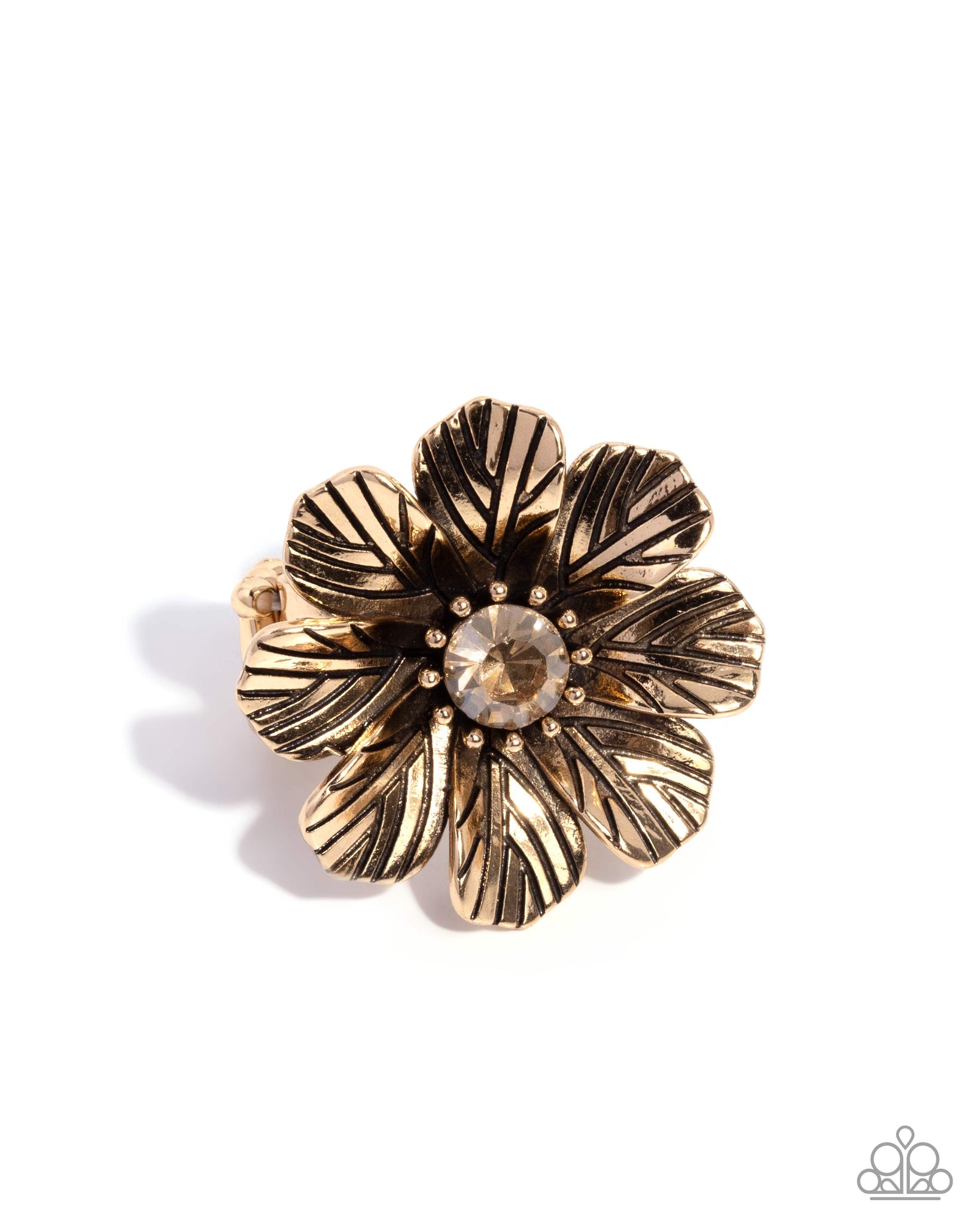 Brushed in a lustrous antiqued gold finish, layers of etched petals bloom around a single, faceted champagne rhinestone center surrounded by tiny gold studs, creating a bold floral centerpiece atop the finger. Features a stretchy band for a flexible fit.