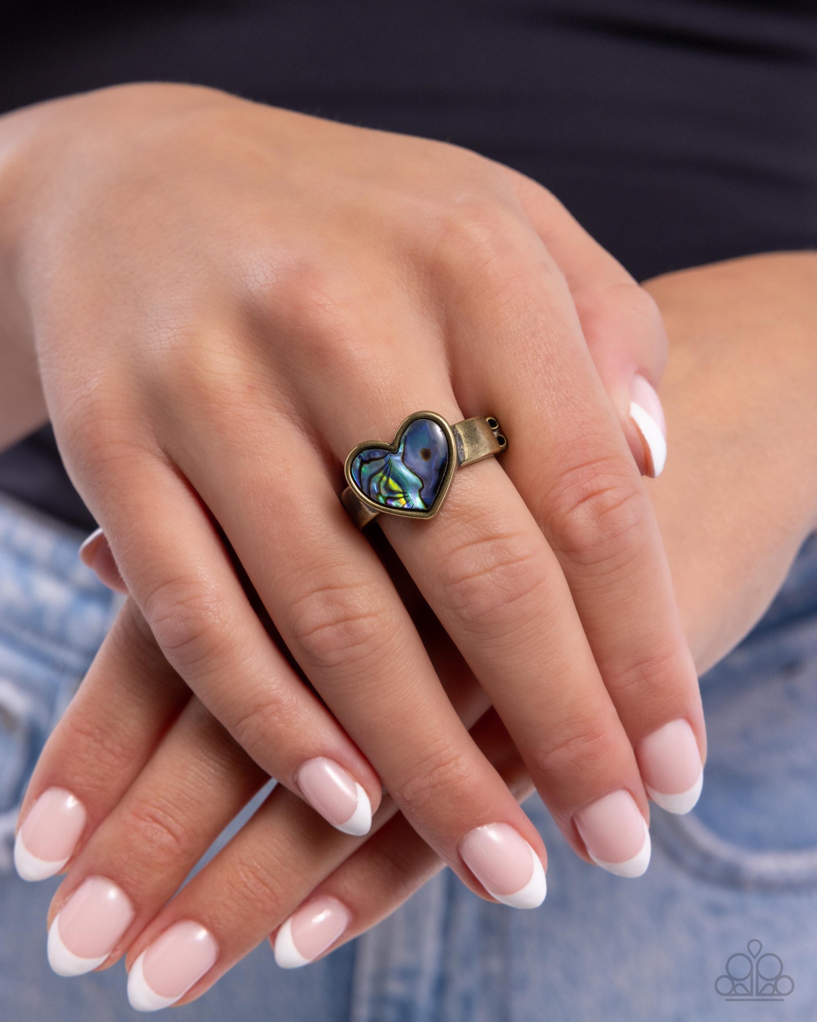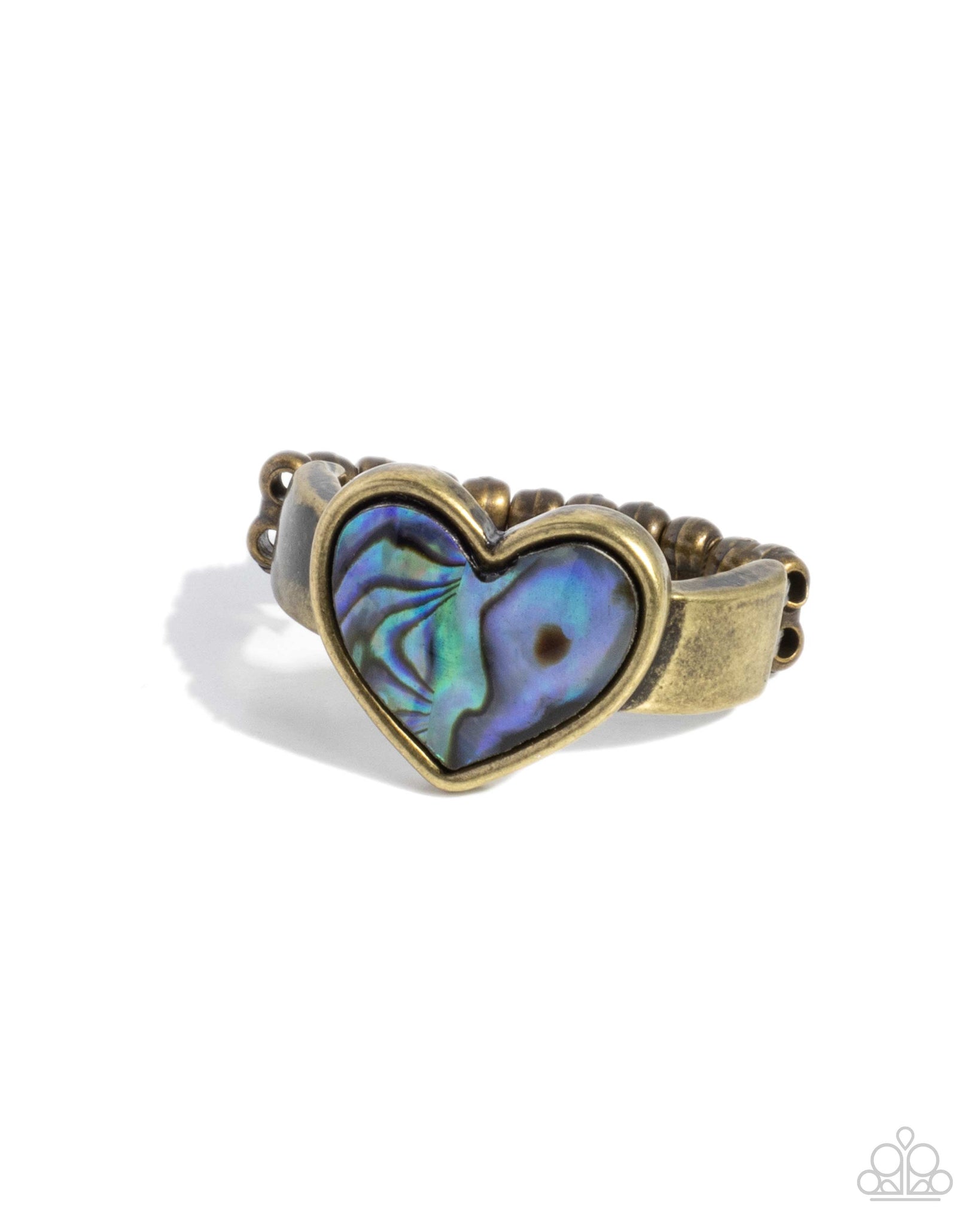 A brass band wraps around the finger, featuring a heart-shaped frame filled with an iridescent faux-abalone shell, creating a striking contrast. Features a stretchy band for a flexible fit. As the shell elements in this piece are natural, some color variation is normal.