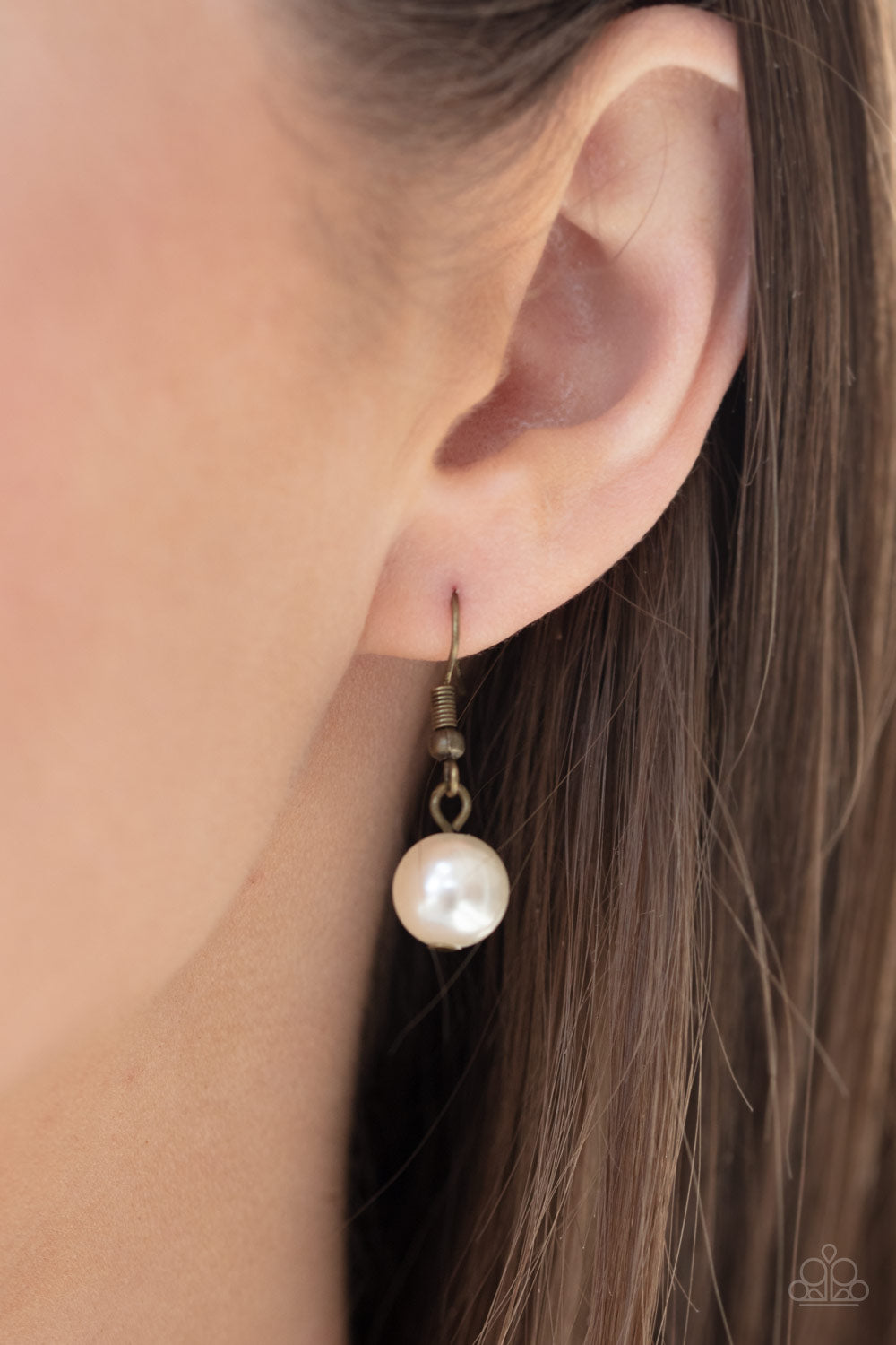 A collection of white pearls and glassy white rhinestone encrusted rings give way to mismatched strands of brass chain and dainty pearls layering down the chest for a vintage inspired fashion. Features an adjustable clasp closure.